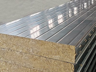 不銹鋼巖棉夾芯板其上下表面采用一面不銹鋼板一面彩鋼板或雙面不銹鋼板,厚度為0.4-0.8mm。通過(guò)自動(dòng)化連續(xù)成型機(jī),經(jīng)壓型后用高強(qiáng)粘合劑粘合而成。巖棉塊交錯(cuò)鋪設(shè),其纖維走向垂直于不銹鋼巖棉夾芯板的上下表面,并緊密相接充實(shí)了不銹鋼夾芯板的整個(gè)縱橫截面。巖棉塊之間和巖棉與上、下層鋼板之間通過(guò)高強(qiáng)度發(fā)泡劑粘接復(fù)合而成。不銹鋼巖棉夾芯板板有很強(qiáng)的剛度,具有防火、保溫、隔音等性能。